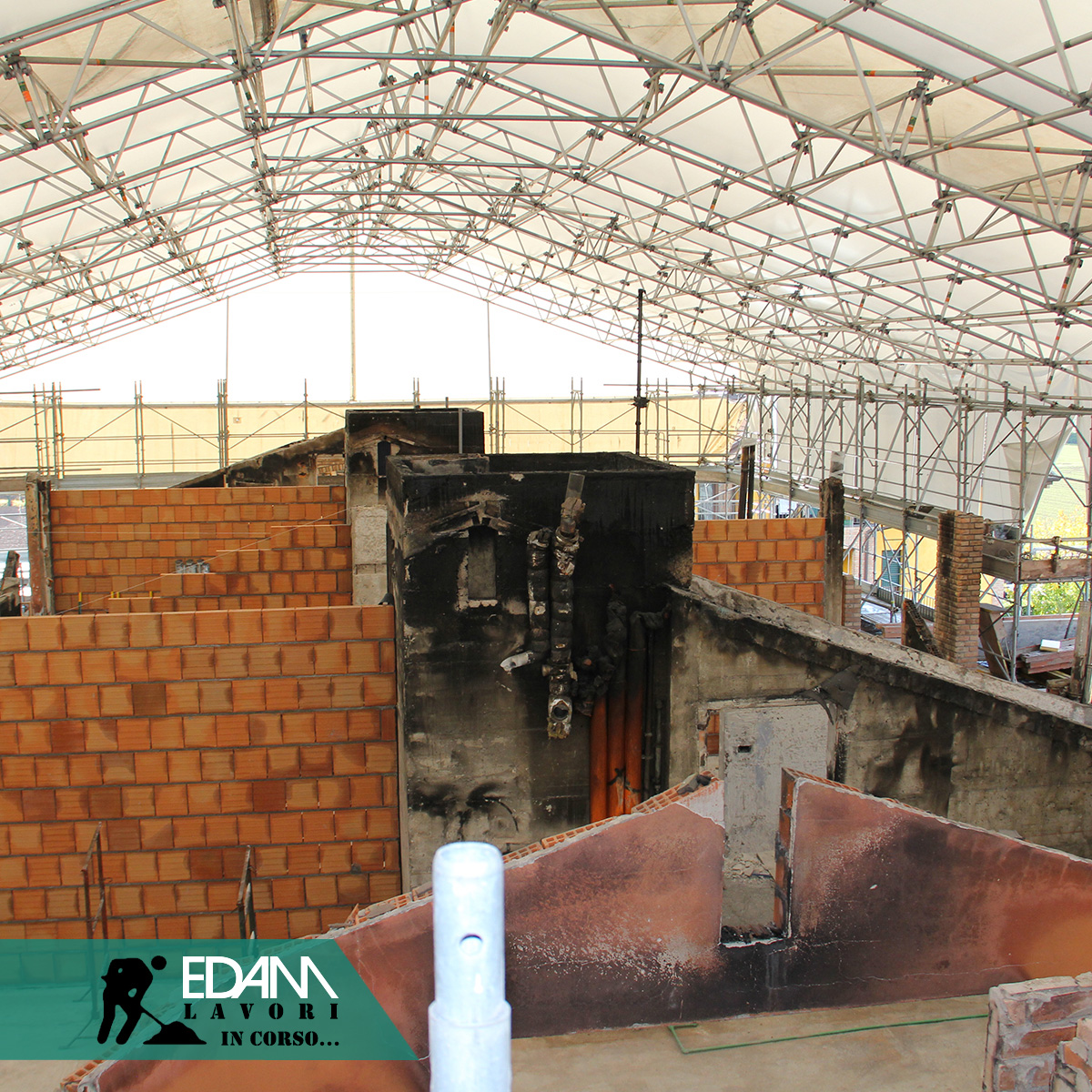 Si procede alla copertura provvisoria, previa demolizione di comignoli e della parte di tetto pericolante. Successivamente vengono demolite le mura rimanenti degli appartamenti all’ultimo piano, smaltite le macerie e si inizia la vera e propria ricostruzione post incendio degli appartamenti. La restante parte del palazzo viene bonificata dai residui carboniosi. Vengono anche bonificati, decontaminati e deodorizzati gli altri appartamenti.